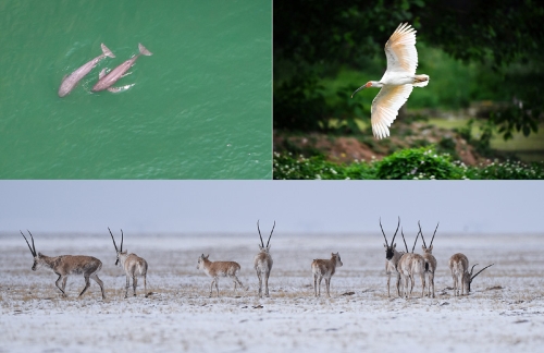 這是一張拼版照片:左上圖為在湖北省宜昌市江邊,長(zhǎng)江江豚在水中嬉戲(無(wú)人機(jī)照片,新華社記者肖藝九5月11日攝);右上圖為陜西省漢中市洋縣朱鹮生態(tài)園內(nèi)的朱鹮(新華社記者劉瀟5月13日攝);下圖為藏羚羊在三江源可可西里地區(qū)活動(dòng)(新華社記者吳剛4月20日攝)。新華社發(fā)