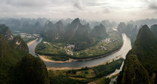 這是2018年10月18日拍攝的廣西桂林陽(yáng)朔縣興坪鎮(zhèn)的漓江景色(無(wú)人機(jī)拼接照片)。新華社記者 李鑫 攝