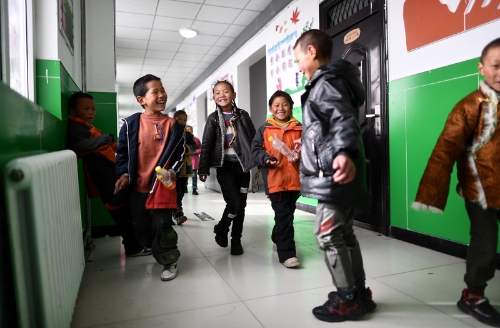 2021年3月26日,青,敹嗫h民族寄宿制中學(xué)二年級(jí)的學(xué)生在課間玩耍。該校目前采用清潔取暖方式,學(xué)生的學(xué)習(xí)和生活環(huán)境大為改善。新華社記者 張宏祥 攝