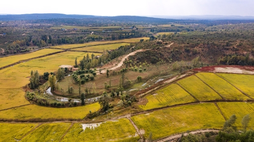 2020年9月26日拍攝的陜西省靖邊縣黃蒿界鎮(zhèn)馬季溝村稻田(無(wú)人機(jī)照片)。近年來(lái),靖邊縣實(shí)施了“三北”防護(hù)林、退耕還林、流域治理等生態(tài)建設(shè)工程,北部沙漠區(qū)裸露明沙完全消失,中部農(nóng)田林網(wǎng)蔚然成蔭,南部山區(qū)夏季綠色滿山。新華社記者 陶明 攝