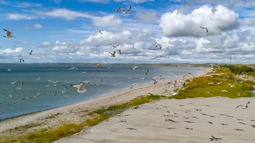 這是2019年8月28日拍攝的呼倫湖畔的水鳥(無(wú)人機(jī)照片)。新華社記者 沈伯韓 攝