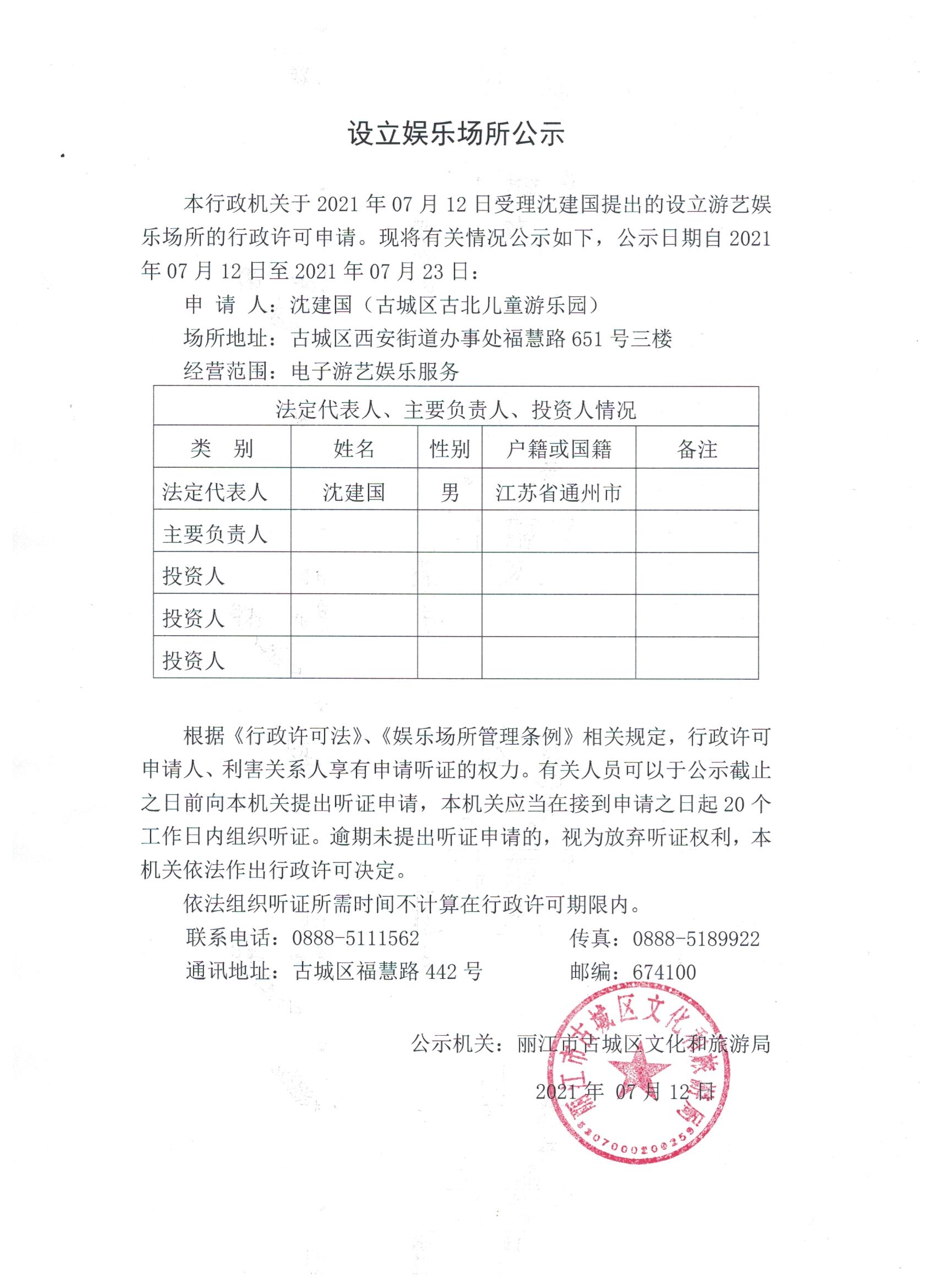 麗江市古城區(qū)文化和旅游局關(guān)于沈建國(guó)申請(qǐng)?jiān)O(shè)立游藝娛樂場(chǎng)所的公示