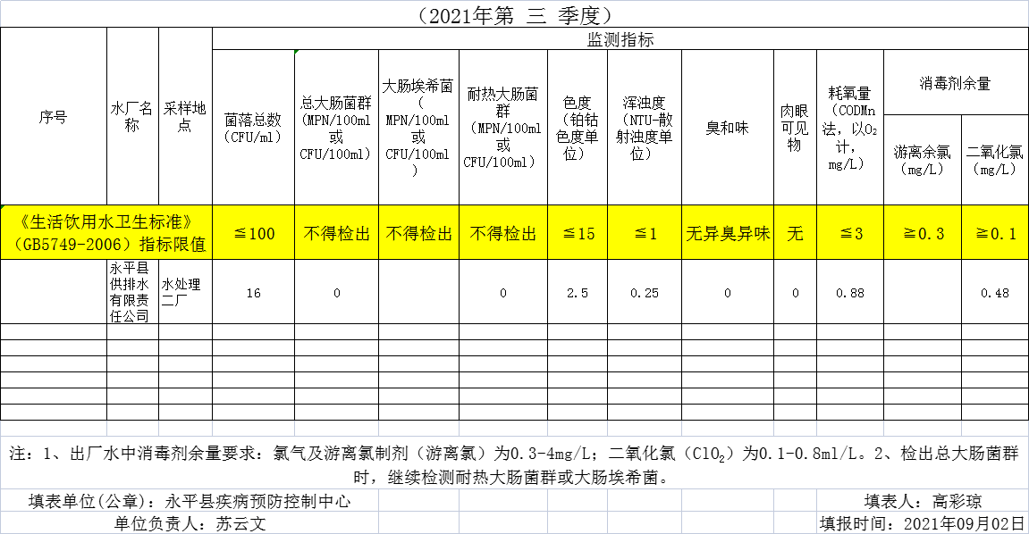 大理市永平縣城市水廠(chǎng)出廠(chǎng)水水質(zhì)信息