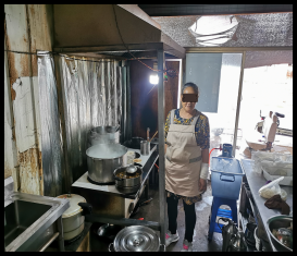 4、后廚環(huán)境差,物品擺放雜亂,灶臺(tái)、墻面油污重。