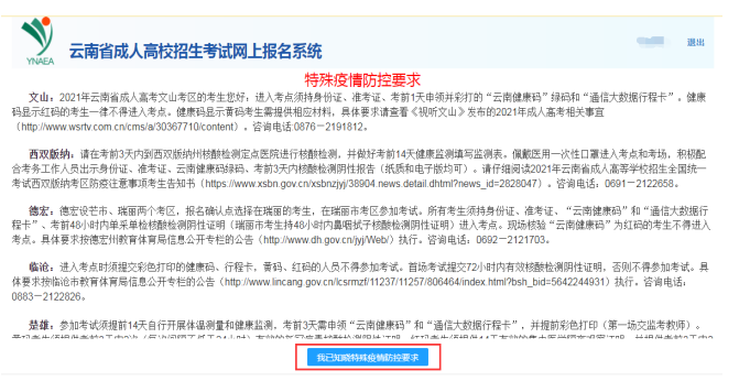6.緊接著考生要認真閱讀《特殊疫情防控要求》,有在這五個考區(qū)考試的考生需特別留意,點擊“我已知曉特殊疫情防控要求”按鈕。