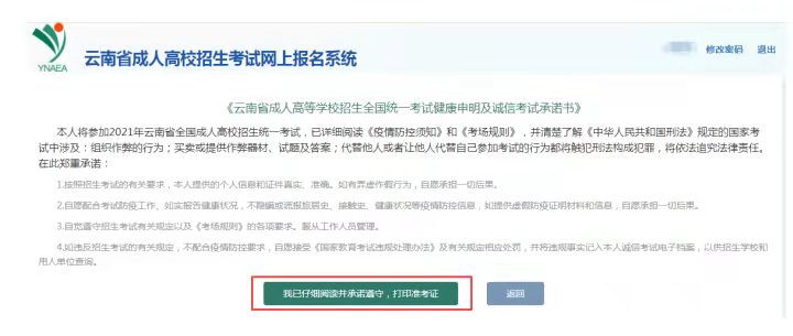 8.考生要仔細閱讀《云南省成人高等學校招生全國統(tǒng)一考試健康申明及誠信考試承諾書》,點擊“我已仔細閱讀并承諾遵守,打印準考證”按鈕。