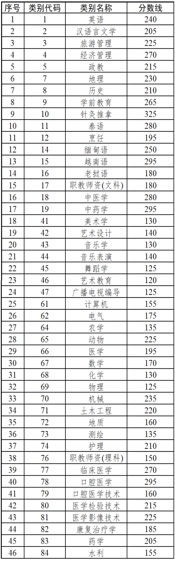 云南省2022年普通高等學(xué)校本科招收應(yīng)屆專科畢業(yè)生升學(xué)統(tǒng)一考試各專業(yè)類別分?jǐn)?shù)線