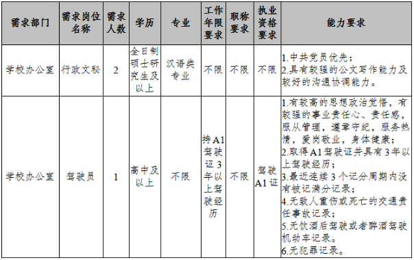 為適應學校發(fā)展的需要,需面向社會誠聘2名行政人員及1名駕駛員,現將有關事項公告如下: