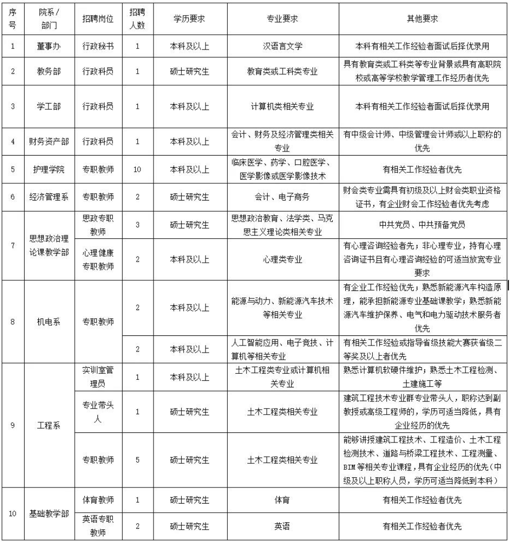 50周歲以下,本科及以上學(xué)歷,中級及以上職稱,計算機、人工智能、汽修、信息管理、旅游管理、烹飪與營養(yǎng)、醫(yī)學(xué)類、教育管理等專業(yè)或相近專業(yè)教育背景,本崗位工作經(jīng)歷超過3年以上;有對應(yīng)相關(guān)專業(yè)的教學(xué)科研工作經(jīng)歷;對專業(yè)(群)建設(shè)具有戰(zhàn)略性構(gòu)想和創(chuàng)新性思維;有帶領(lǐng)教師團隊建設(shè)一流專業(yè)的能力;持副高級以上職稱、碩士研究生與博士研究生優(yōu)先聘用。(博士、教授,男放寬至60周歲以下,女放寬至55周歲以下)。