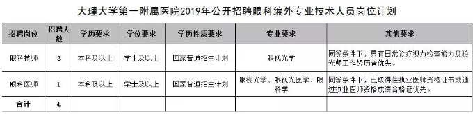 因工作需要,大理大學第一附屬醫(yī)院眼科面向社會公開招聘編制外專業(yè)技術人員4名,現(xiàn)將有關招聘事宜公告如下: