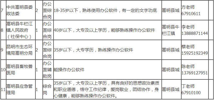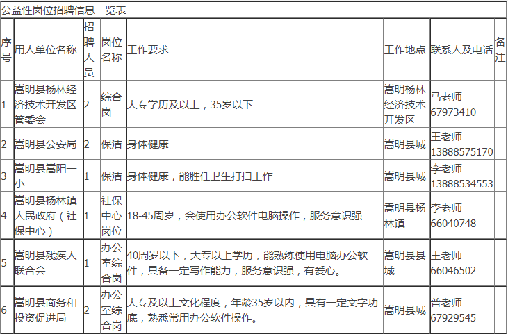 招聘具體事宜請咨詢用人單位。符合公益性崗位上崗條件的個(gè)人也可以到嵩明縣勞動就業(yè)服務(wù)局綜合科申請公益性崗位求職登記,詳詢陳老師:0871-67917444。