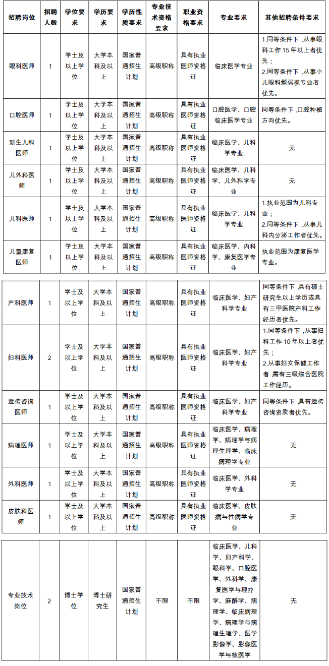1.副高及以上職稱(新生兒科醫(yī)師、兒外科醫(yī)師、兒科醫(yī)師、兒童康復醫(yī)師、產科醫(yī)師、婦科醫(yī)師、病理醫(yī)師、外科醫(yī)師、皮膚科醫(yī)師)