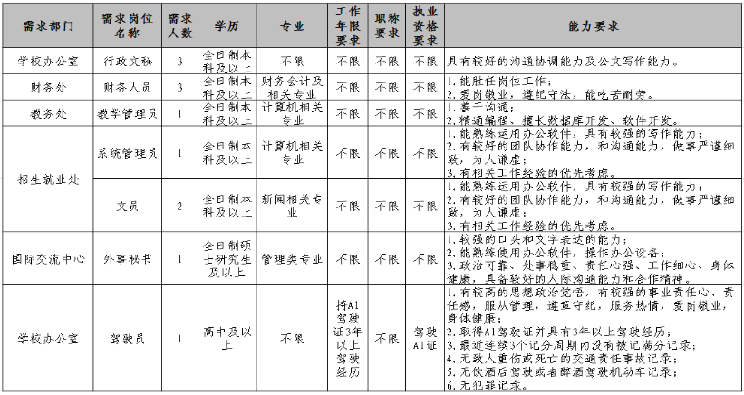 為適應(yīng)學(xué)校發(fā)展的需要,需面向社會(huì)誠(chéng)聘12名工作人員,現(xiàn)將有關(guān)事項(xiàng)公告如下: